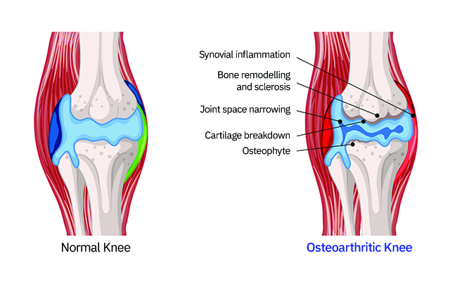연골이 닳아 없어지며 연골 밑의 뼈가 노출되거나, 관절 주변의